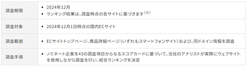 今回は、ライフスタイルの多様化とその利便性の高さから、もはや我々の日常生活にかかせない存在として、また、経済活動における中心的役割として日々影響力を高めているECサイトのうち、日本国内の43 BtoC-EC(消費者向け電子商取引)サイトをノミネートし評価しました。(一定基準を満たすサイトを予備調査の上、ノミネートしています。)