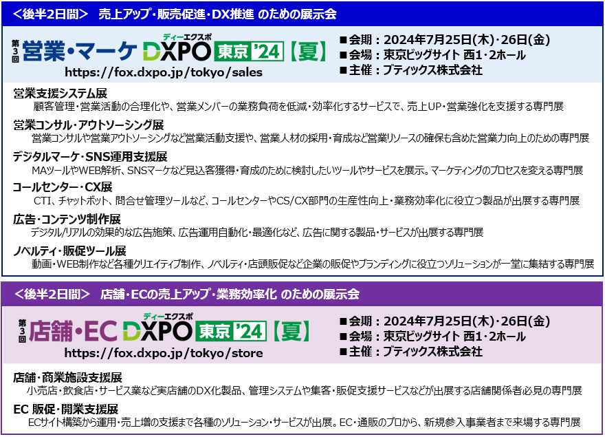 同じく後半2日間[ 2024年7月25日(木)・26日(金) ]開催の『第3回 店舗・EC DXPO東京’24 【夏】』は、製品ジャンル毎に2つの展示会で構成され、実店舗のDX化・集客・販促から、ECサイトの構築・運用・売上増まで、実店舗やEC・通販で活躍する注目のIT製品が一堂に出揃う。来場対象者は、様々な店舗関係者やEC・通販のプロや新規参入事業者の方々である。