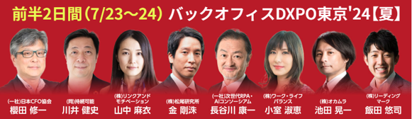 バックオフィスDXPO東京'24【夏】では、日本におけるAI研究の最高峰である(株)松尾研究所の金剛洙氏、3000社以上の働き方改革を支援してきた(株)ワーク・ライフバランス 小室淑恵氏が登壇。その他にも、本分野の第一線で活躍する方々を講師にお招きし、全64セッションを開催する。