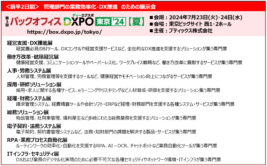 前半2日間[2024年7月23日(火)・24日(水)]開催の『第3回 バックオフィスDXPO東京’24【夏】』は、製品ジャンル毎に9つの展示会で構成され、管理部門の業務効率化・DX推進を支援する注目のIT製品が一堂に出揃う。来場対象者は、あらゆる業種の経営層、バックオフィス部門(総務・人事・労務・経理・財務・法務・情報システム等)の方々である。