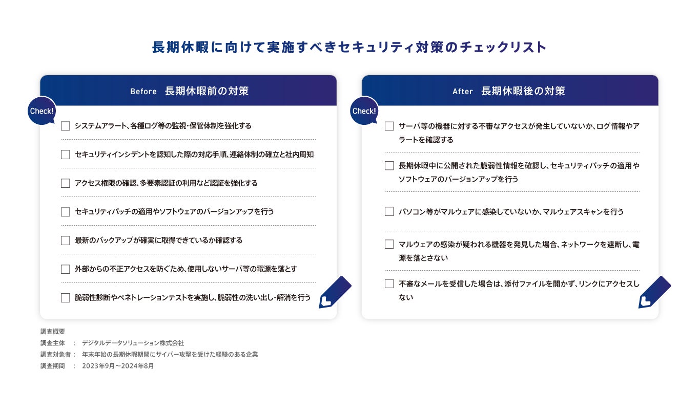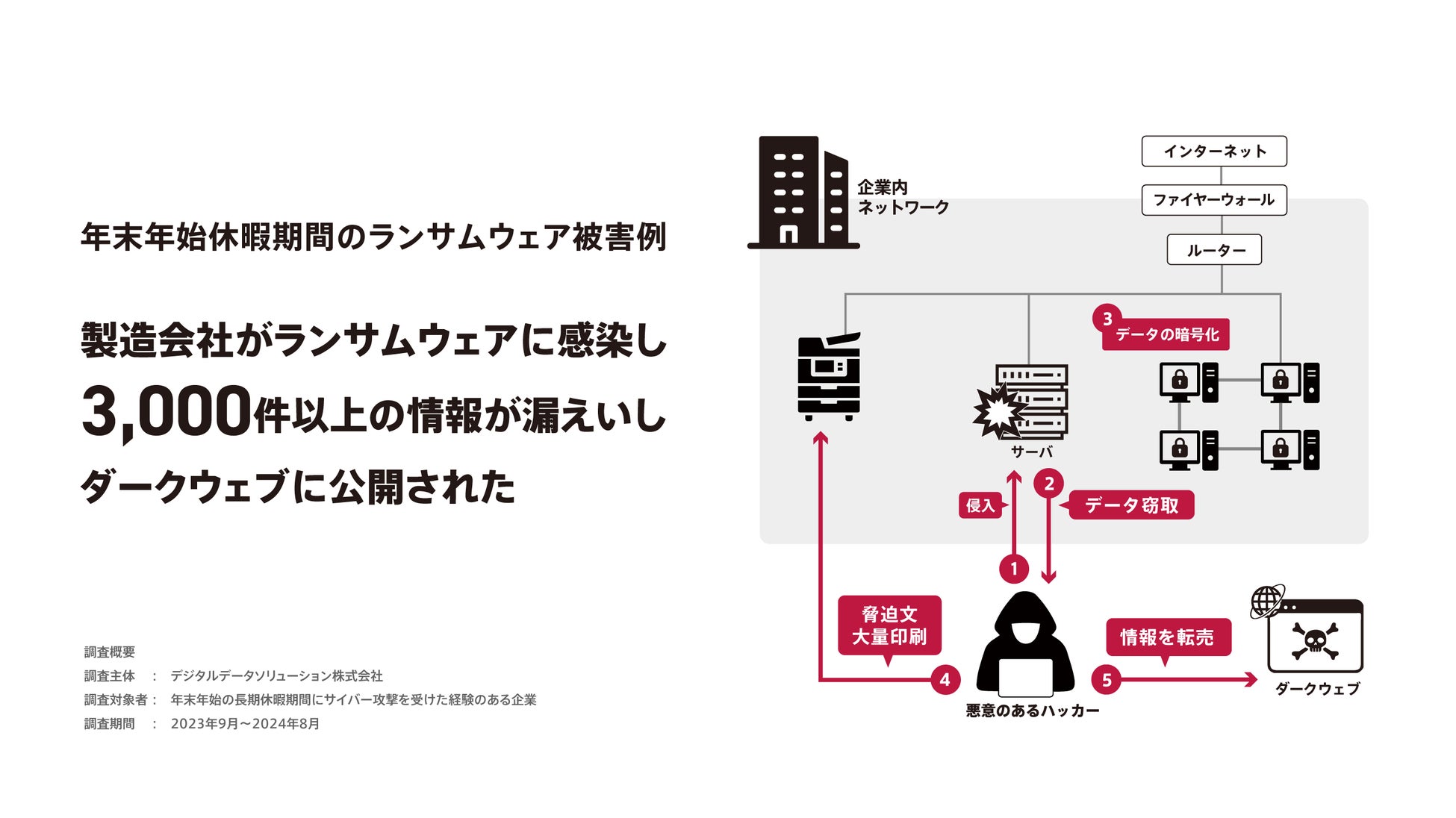 年末年始に潜むサイバーセキュリティリスクの被害実態を明らかにするため、デジタルデータソリューションでは、年末年始の長期休暇中にサイバー攻撃を受けた企業に向けて調査を実施しました。より具体的な事例を紹介することで、同様の被害が発生しないよう未然防止に役立てていただきたいと考え、調査結果を公表いたします。