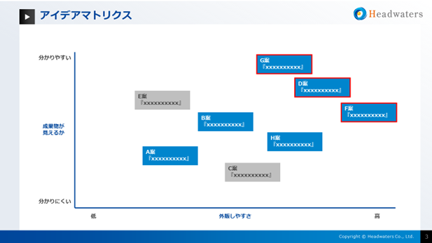 ② アイデアソンを開催して、8つのカンパニーが持つ事業課題を解決するアイデアを多数創出しました。そこからヘッドウォータースグループのデータサイエンティストとの壁打ちを通じてアイデアを8個に絞り込み、事業企画を詰めました。