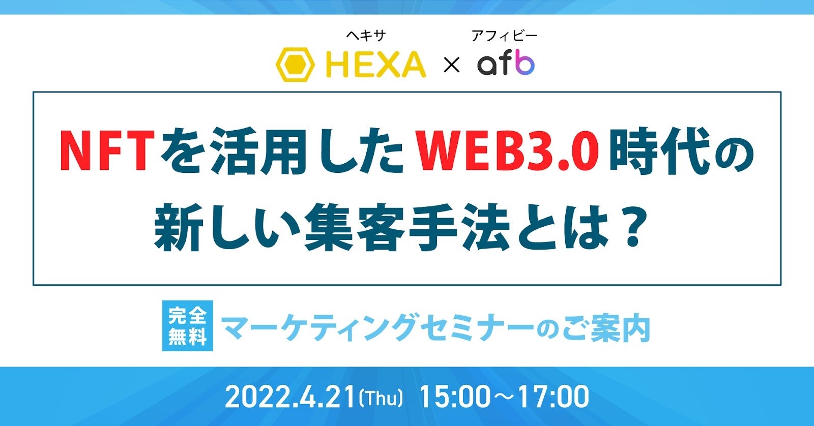 - 『NFTを活用したWEB3.0時代の新しい集客手法とは』HEXA(ヘキサ)×afb(アフィビー)による完全無料のマーケティングセミナーのご案内