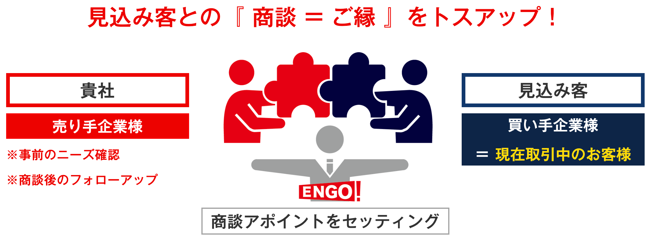貴社の商品やサービスの特徴・ターゲット・商談条件を事前にヒアリングし、見込み客(買い手企業様)との『商談=ご縁』をお繋ぎいたします。