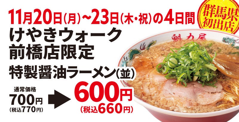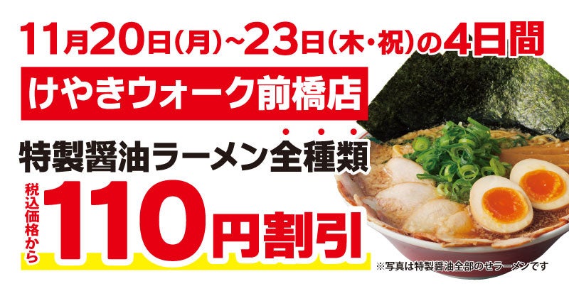 この度オープンを記念して、「けやきウォーク前橋店」にご来店いただいたお客様には、『特製醤油ラーメン全種類』を税込価格から110円割引で販売いたします。