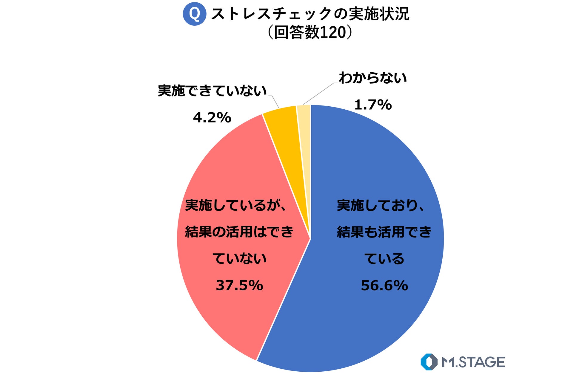 ストレスチェックの実施状況について質問したところ、「実施しており、結果も活用できている」56.6%、「実施しているが、結果の活用はできていない」37.5%、となりました。