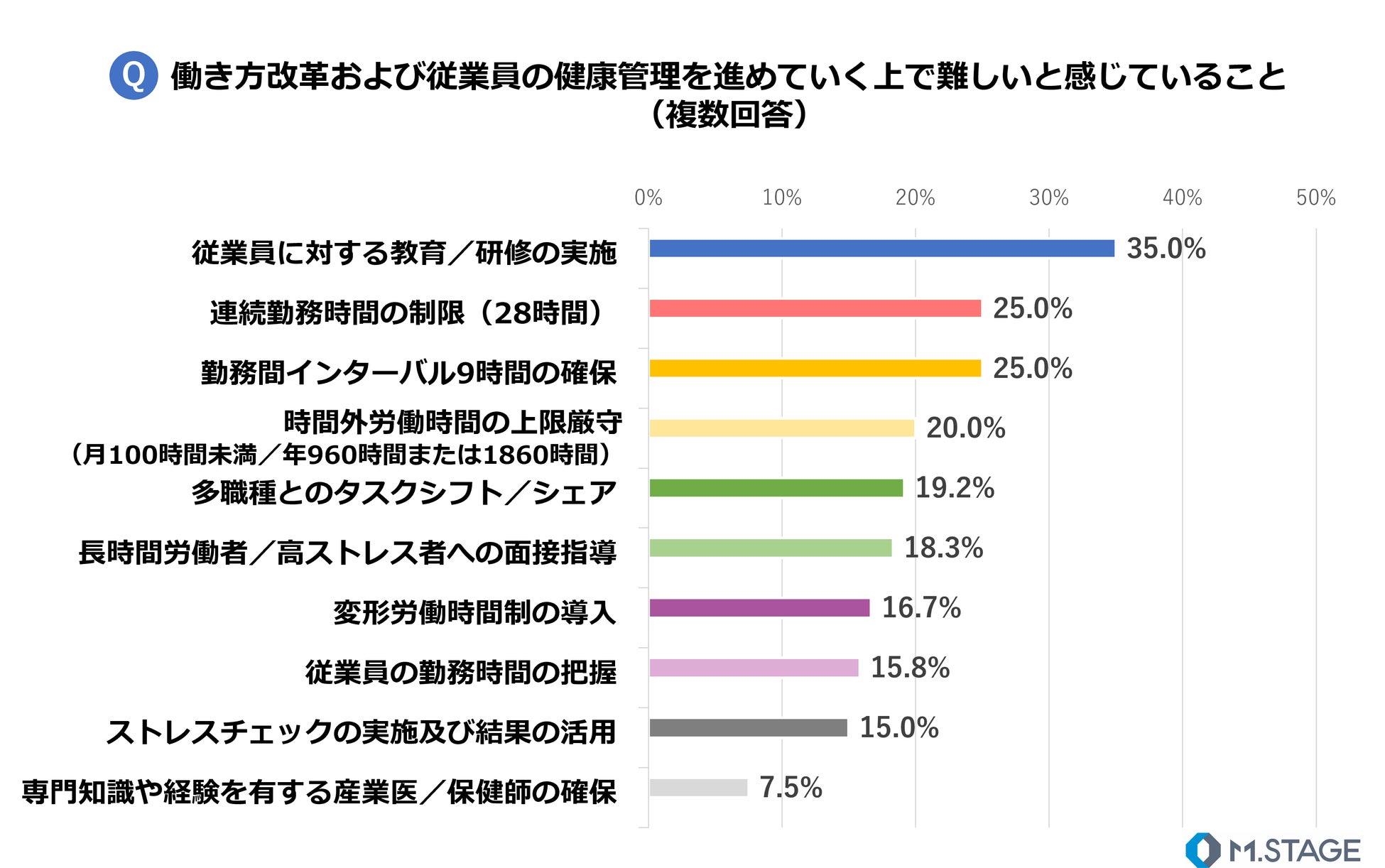 働き方改革および従業員の健康管理を進める上で難しいと感じていることについて質問したところ、TOP3は1位「従業員に対する教育/研修の実施」35%、2位「連続勤務時間の制限」25%、3位「勤務間インターバル9時間の確保」25%となりました。