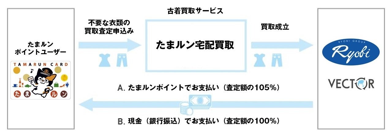 ベクトルが、「たまルン」のポイントユーザーの不要になったファッションアイテムを「たまルン宅配買取サービス」を通じて買い取ります。買取の査定額は、ネットショップ「たまルンMALL」で利用可能な「たまルンポイント」もしくは現金でお支払いします。ポイントでの受け取りを選択した場合は、査定金額を5%アップします。お申込みフォーム(URL:https://tamarun.kaitori-vector.jp/)から必要事項をご入力いただき、お申込みください。サービスの利用には「たまルン」のカード番号が必要となります。