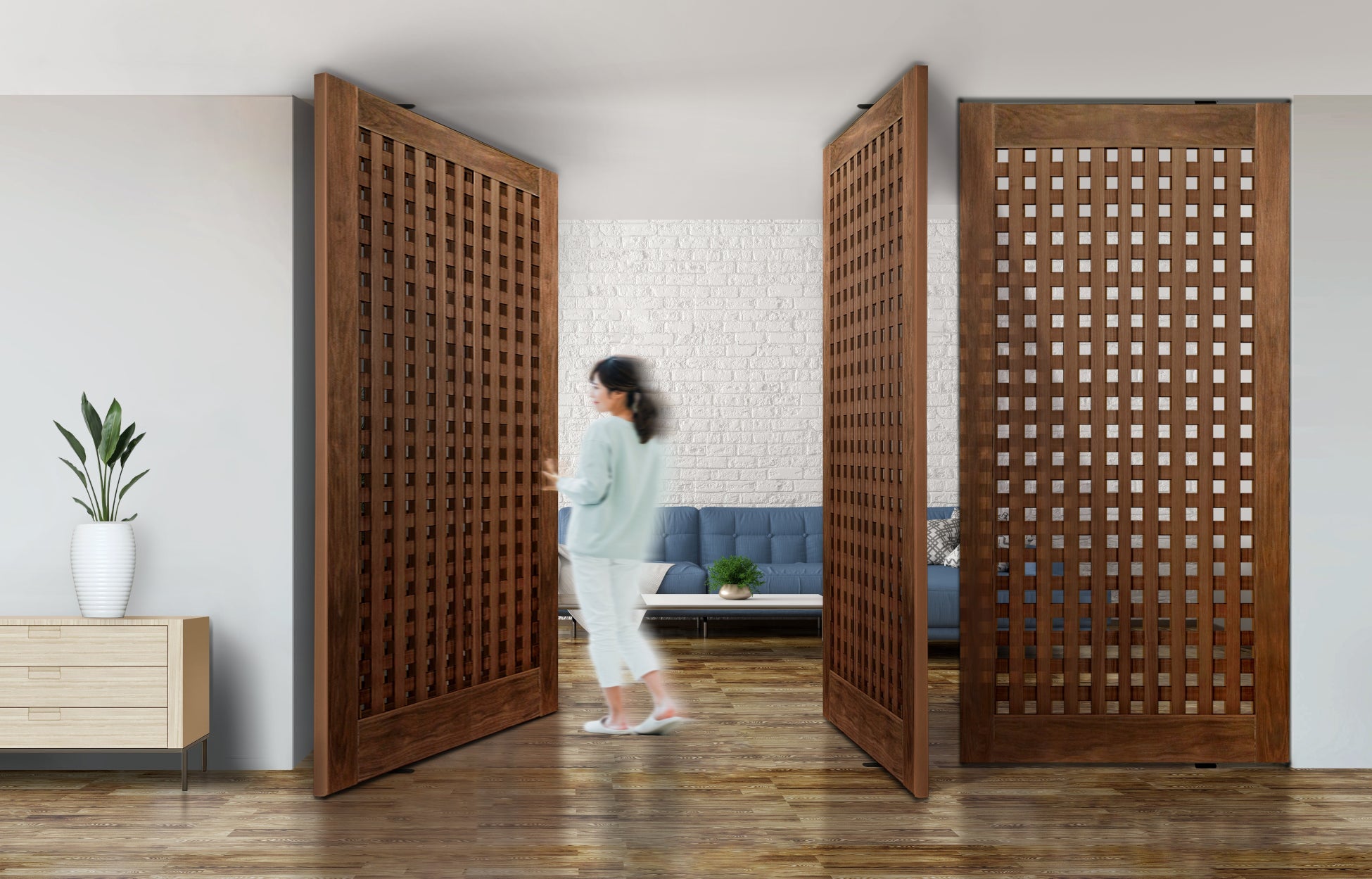 「ソリスト」にはハンドルも引手もありません。軽く手で押すことで簡単に開閉し、手前にも奥にも滑らかにスイングする全く新しいタイプの回転ドアです。一般的な室内ドアの高さ2mに対し、当社のドアは2.4mと天井まで高さがあります。また、通常70cm程度の扉幅も1.2mと広く設定しており、大きな開口にぴったりのドアです。このドアは、並べて使うことで空間に可変性を与えるということをポイントに開発いたしました。連続して並べることで、閉じていれば壁の機能を果たしながらどこからでも通り抜けできるところが特長です。出入口としてのドアと視界を遮る壁の2つの機能を持つ「ソリスト」は、まさに”動く壁”といえます。当社は室内ドア専門メーカーとして、今後も開閉機能にとどまらない価値を生み出し、特別な空間作りに役立つ商品を開発・提供し続けていきます。