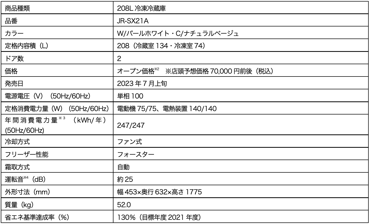 208L冷凍冷蔵庫(JR-SX21A)『freemo』の概要は以下の通りです。