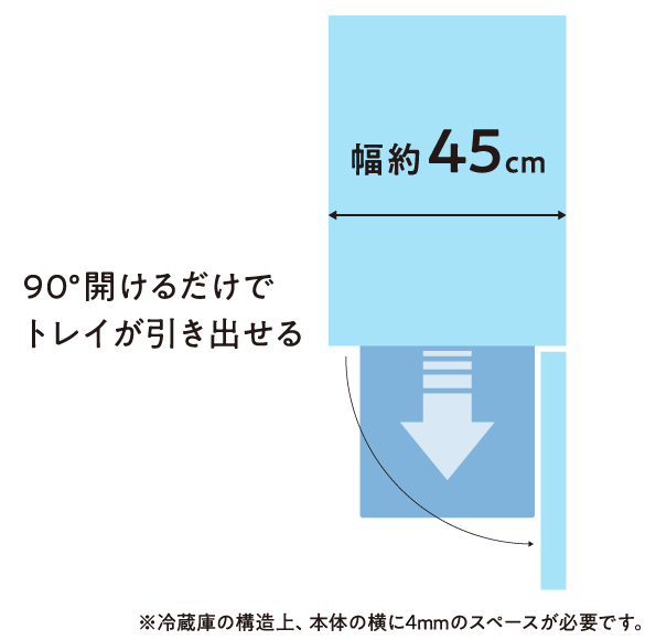 ②「壁際にフィット」設置でも90°ドア開閉で中身の出し入れが可能な設計