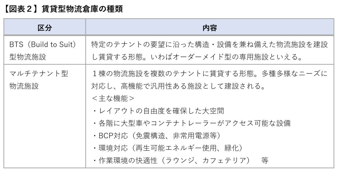 ここで「賃貸型物流施設」について説明すると、その形態は大きく2つに分類されます【図表2】。