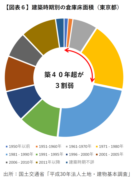 一方、東京都心部には築40~50年の古い倉庫が多く(東京都内でみても現時点で築40年超が3割弱、10年後には5割を超える)、災害への安全性(耐震性等)、最新設備の欠如、環境性能などで問題を抱えるものも多数あることが懸念されています【図表6】。