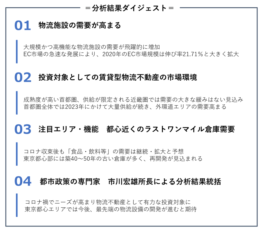 このたび同研究所では、調査・研究の第17弾として、物流施設の市場規模、中でもとりわけ投資対象としての注目すべき賃貸型物流施設の機能・エリアの可能性について紹介します。