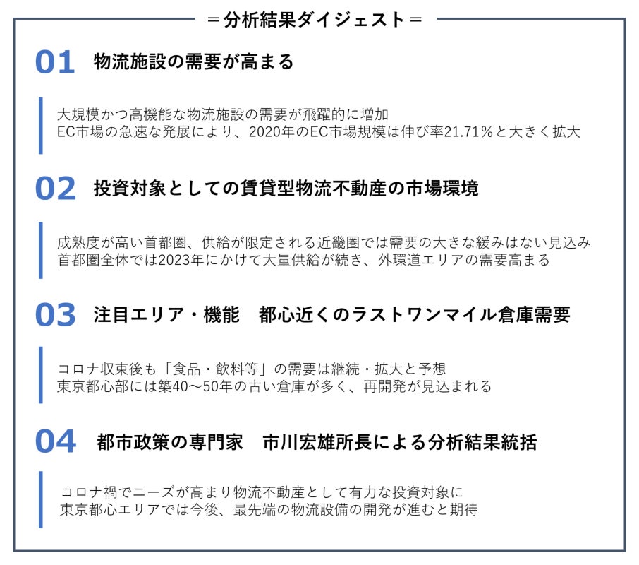 こうした東京都心部の倉庫の再開発や、都心外周部のマルチテナント型物流施設のタイアップなどにより、今後、東京のラストワンマイルを支える最先端の物流施設が建設されていくことが予測されます。