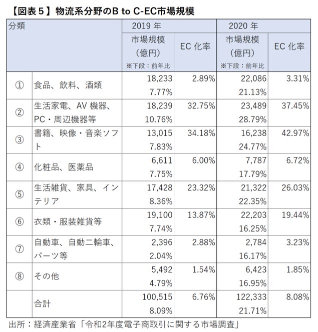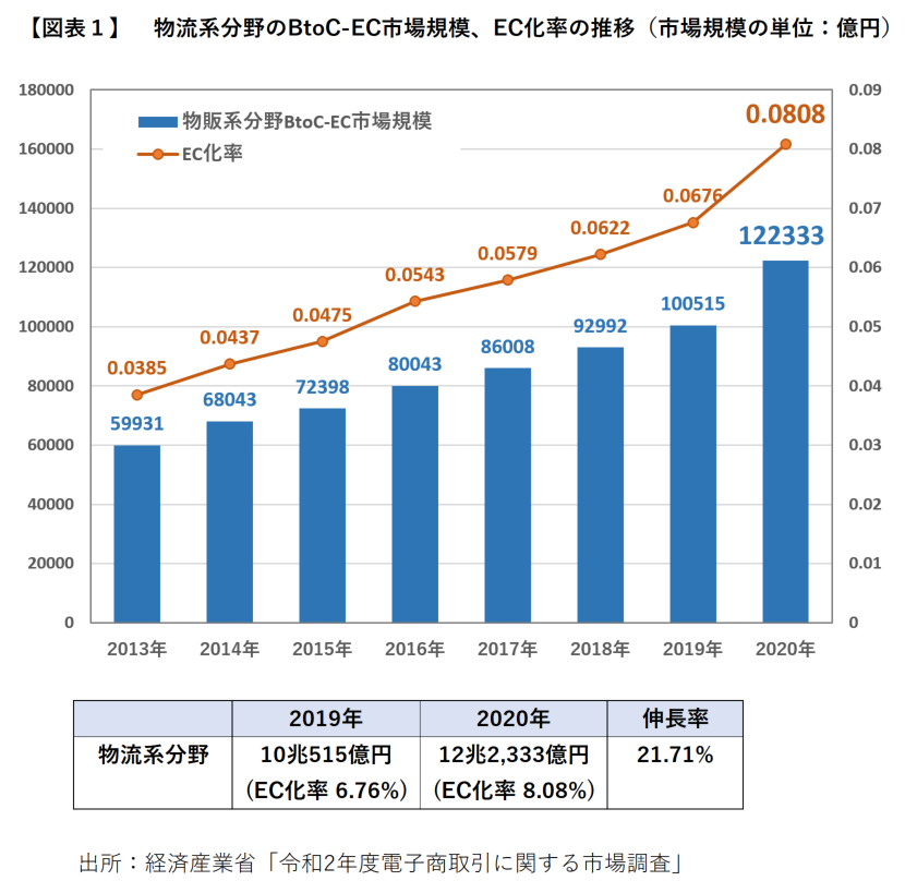 EC化率(全ての商取引に対するECによる取引割合)も8.08%と、前年から1.32ポイント増と跳ね上がりました【図表1】。