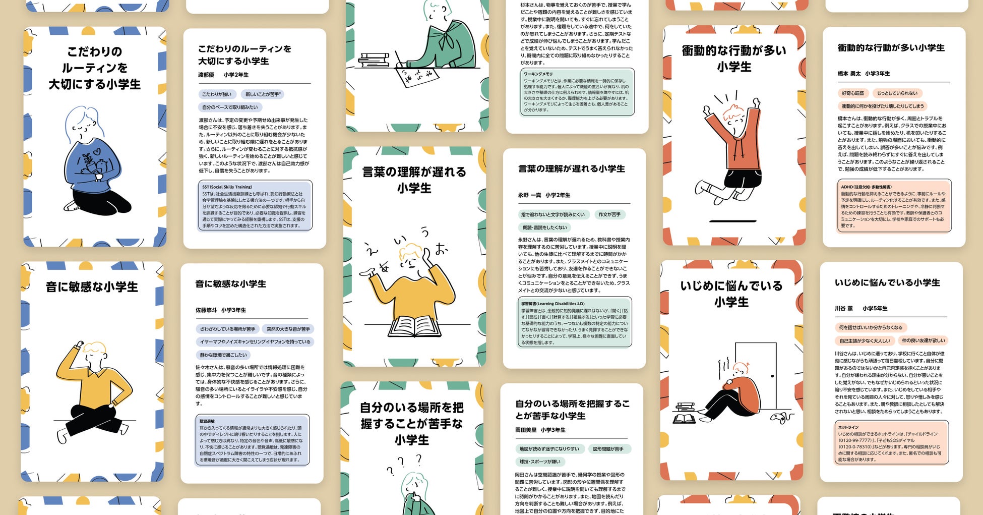 具体的には、自閉症スペクトラム障害特性・学習障害(Learning Disability:LD)特性・注意欠陥・多動性障害(ADHD)特性などの発達障害/神経発達症や、いじめ被害、不登校・ひきこもり、医療的ケア児、海外にルーツのあるこども、LGBTQなどの多様な特性を想定可能なペルソナカードを追加いたしました。