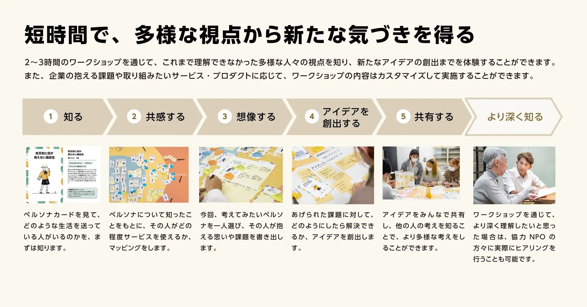 本ワークショップでは、健常者だけでなく、高齢者・障がい者・外国人など多様な人々の視点から課題を発見し、アイデアを創出する考え方を体験することで、自分以外の多様な視点に気づきを得るワークショップです。これまで、得られなかった気づきから以下の活動を後押しします