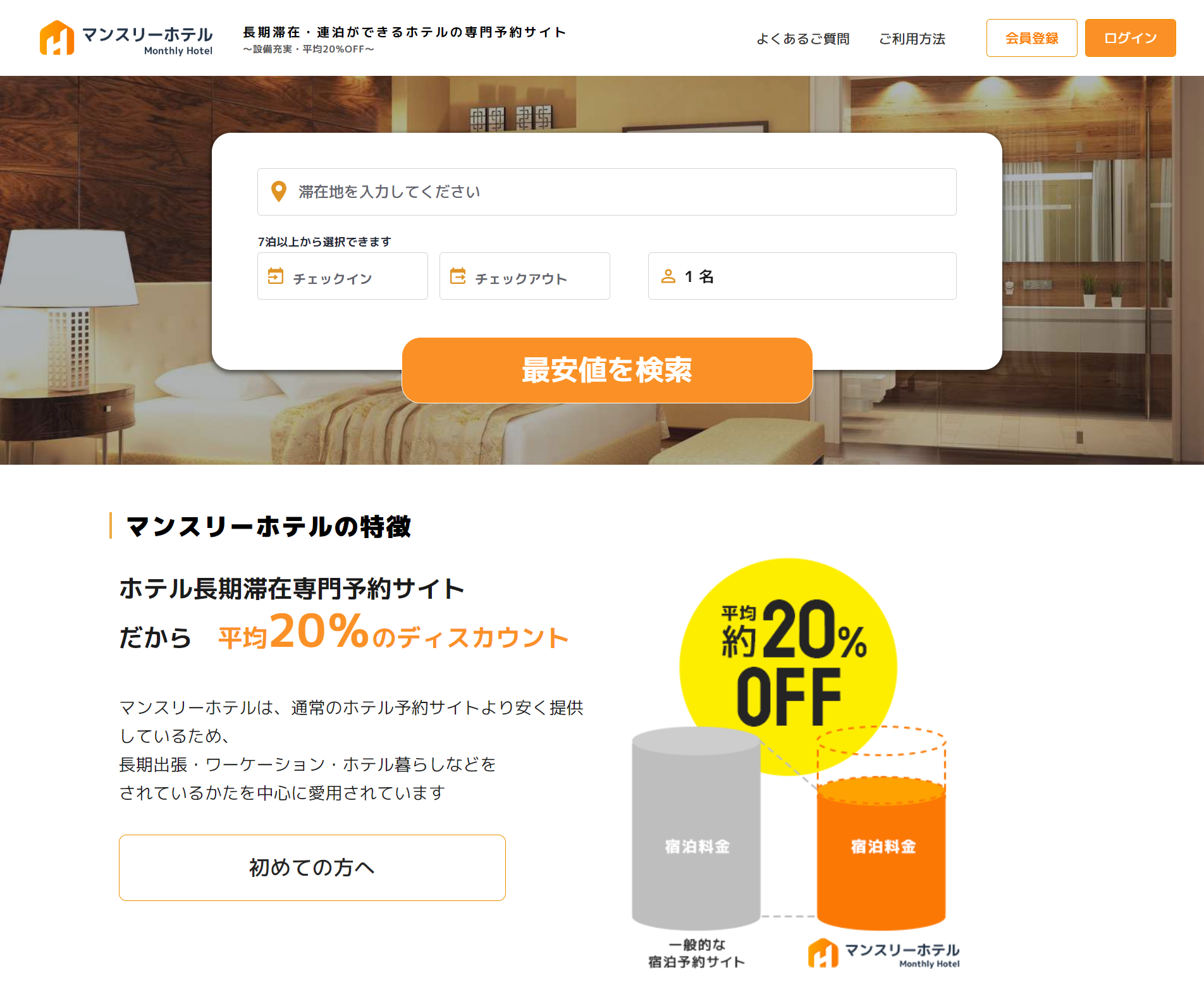 ① 7日間以上、半年までの長期予約がリーズナブルな長期滞在専門ホテル予約サイトです。サイト内には、長期利用が可能なホテルのみが掲載され、現地決済にも対応。1泊当たりの宿泊値(ADR)の最安値より20%以上割引したお得なプランを提供します。会員登録費や水光熱費など無駄な手数料もかかりません。