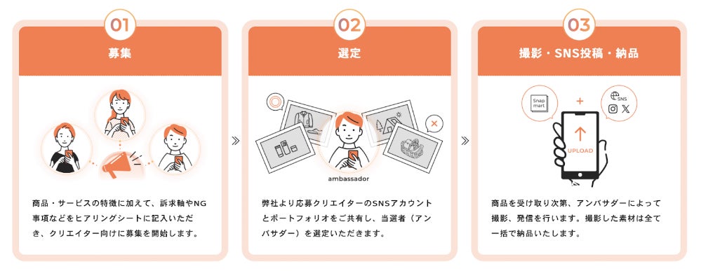 アンバサダープランとは、商品やサービスの撮影・発信を行うアンバサダーを募集し、企業独自の口コミ(SNS投稿)と撮影素材の大量収集を同時に実現するプランです。熱量が高く、リアルな視点での口コミは、SNS上でユーザーの共感を呼ぶことに繋がりファン層の拡大と育成に貢献します。納品した写真や動画、口コミ(SNS投稿)は、媒体不問で無期限に二次利用可能。SNS投稿や広告、Webサイトにご利用いただけます。