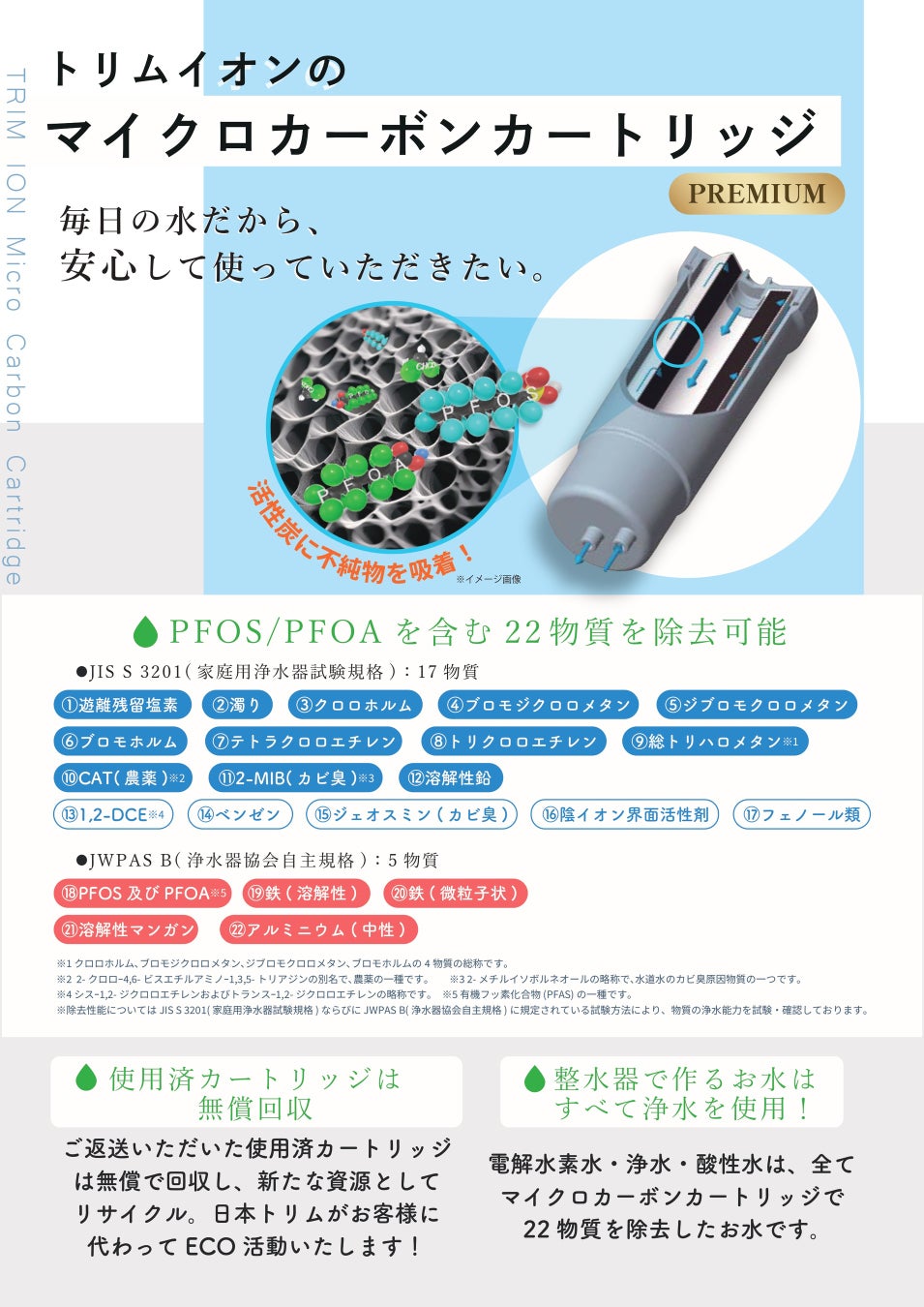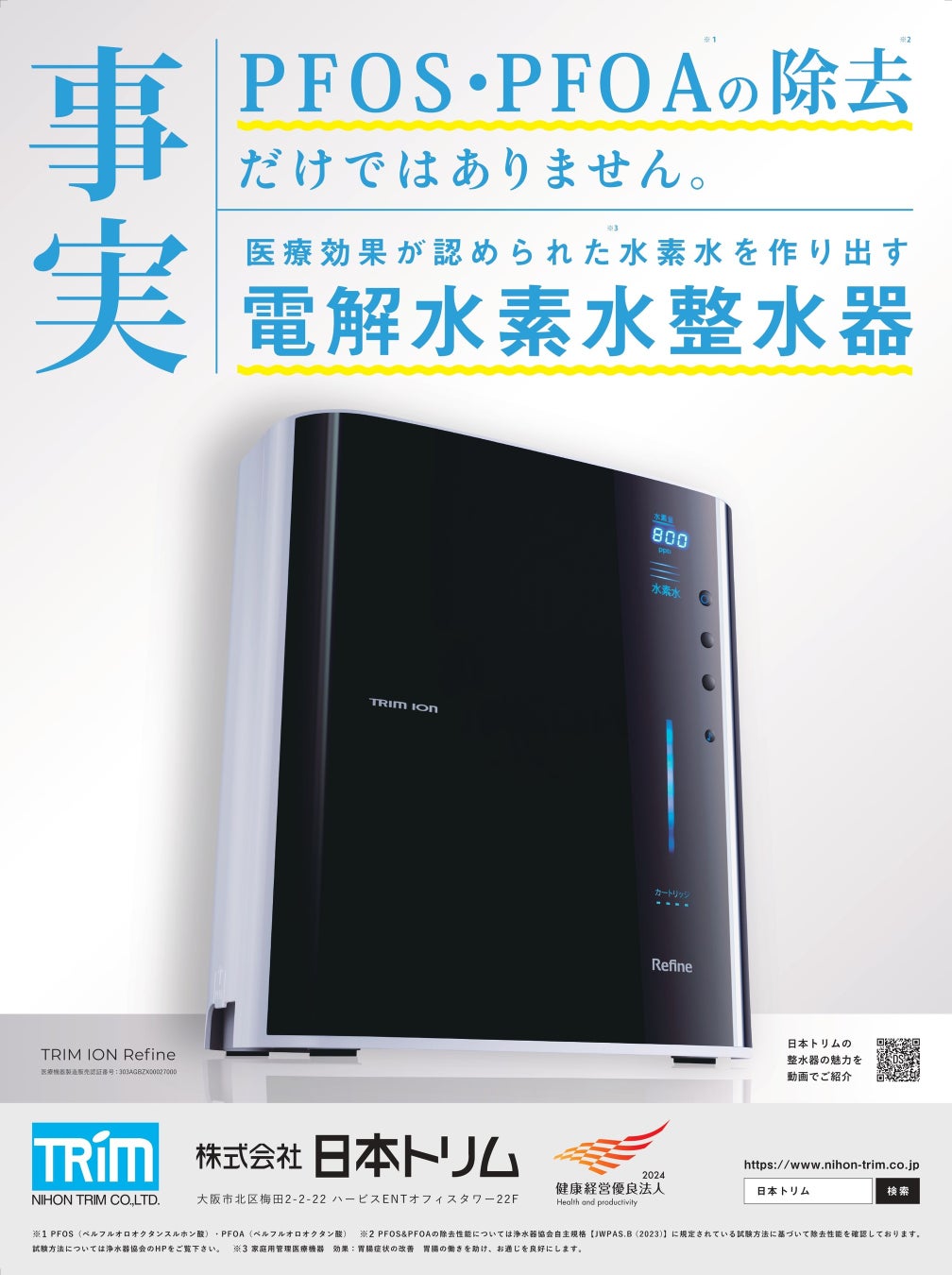 整水器と電解水透析®で健康への寄与を目指す株式会社日本トリム(本社:大阪市、代表取締役社長:田原周夫、以下「日本トリム」)では、医療効果が認められた電解水素水*を作る整水器を製造・販売しています。現在話題のPFASに関する問題を受け、販売中の全ての機種で採用中の「マイクロカーボンカートリッジ」についてのより詳細な資料をホームページ(URL:https://www.nihon-trim.co.jp/wp/wp-content/uploads/2024/09/TRIM-ION-Premium-Micro-Carbon-Cartridge.pdf)で公開しました。
