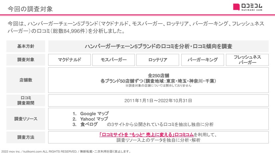 今回は、ハンバーガーチェーン5ブランド(マクドナルド・モスバーガー・ロッテリア・バーガーキング・フレッシュネスバーガー)に寄せられた約8万5000件の口コミを調査し、5ブランドの比較検証を行いました。
