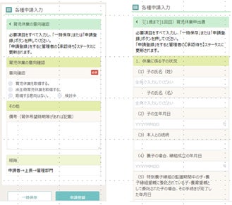 育児休業の制度周知、取得の意向確認、育児休業等の申し出およびその休業取扱通知書の(自動)発行など、一連の申請手続きのプロセスをデジタル化、自動化を実現しました。