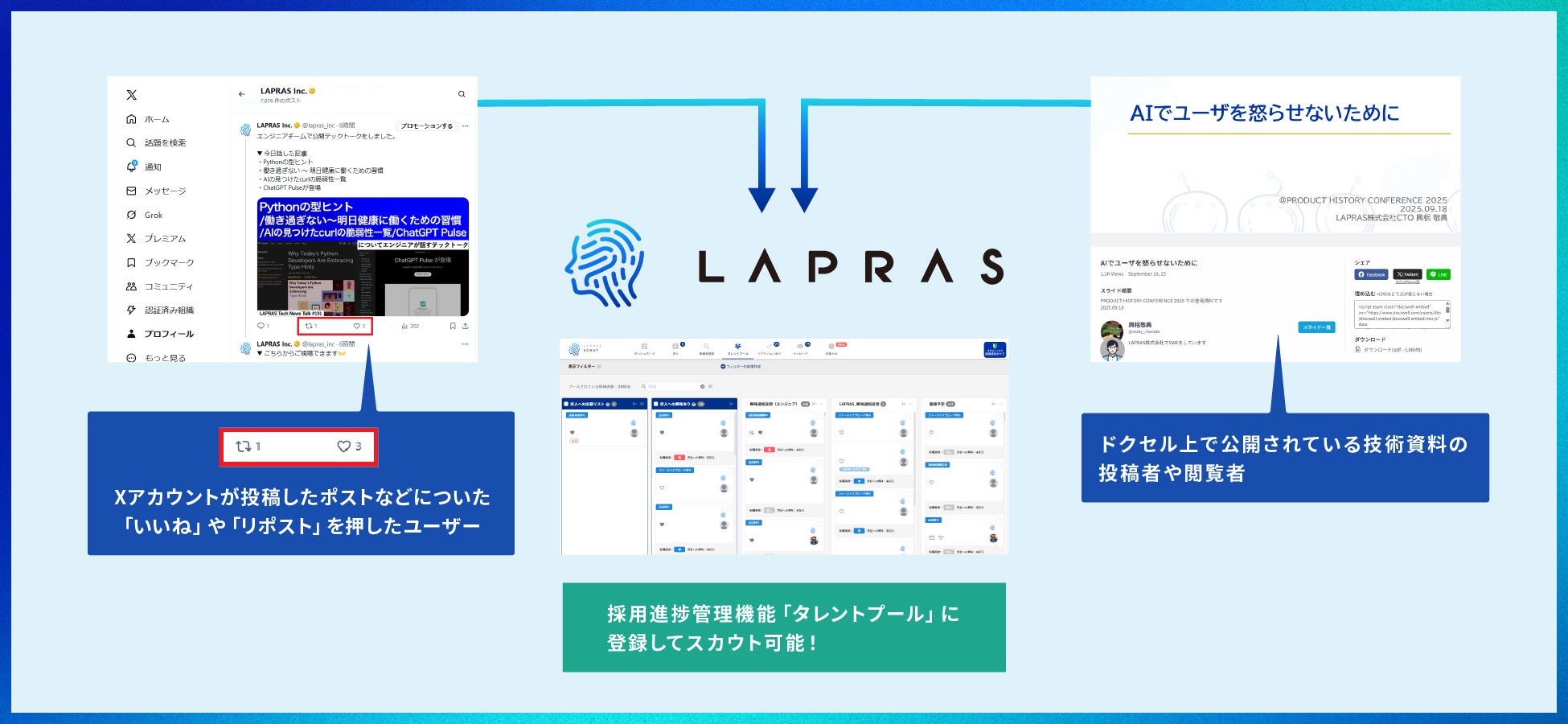 Xのポストへの「いいね」や「リポスト」、またはドクセルでの技術資料の閲覧・作成といった行動は、自社の技術や文化への共感、または特定の技術への高い関心を示しています。これらの行動履歴を持つ方を「LAPRAS Social Search」を通じて特定し、LAPRASの公開情報(スキルや職務経歴など)と紐づけることで、一人ひとりに合わせた魅力的なスカウトを送ることが可能になります。