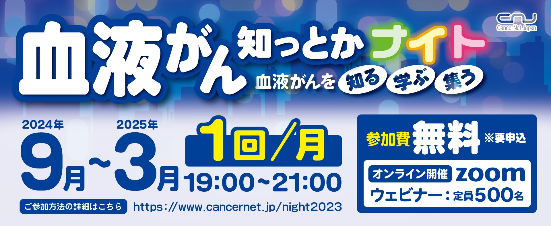 認定NPO法人キャンサーネットジャパン(東京都文京区 理事長 岩瀬 哲)は、昨年に引き続き2024年9月より毎月1回(計7回)血液がんに関するオンラインセミナー「血液がん知っとかナイト」を開催する運びとなりました。