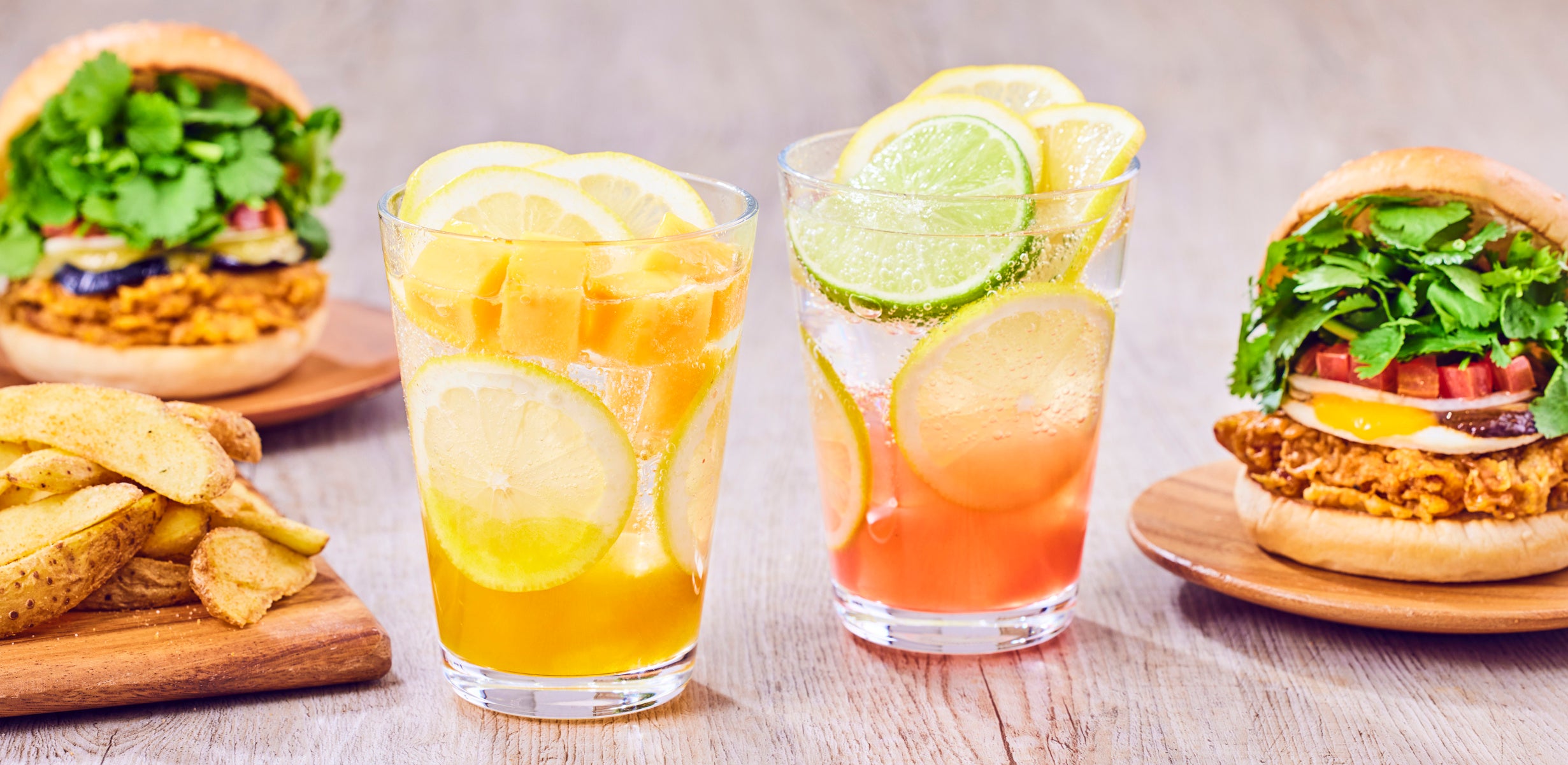 今回は、期間限定パクチーチキンバーガー(ガパオ・グリーンカレー)に合わせて、タイの常夏を彷彿とさせるマンゴーやグァバを使ったドリンクをご用意。店内でじっくりとはちみつに漬け込んだレモンスライスと凍らせたライム、さっぱりとした甘みのグァバソースが入ったトロピカルな「フローズンライムグァバレモネードソーダ」と、同じくはちみつ漬けレモンスライスと凍らせた角切りマンゴー、甘酸っぱいマンゴーソースが入った、ビタミンカラーの「フローズンマンゴーレモネードソーダ」の2種類をご用意いたしました。“素材感” “満足感”を感じていただける暑くなり始める季節にぴったりの涼しげな商品です。