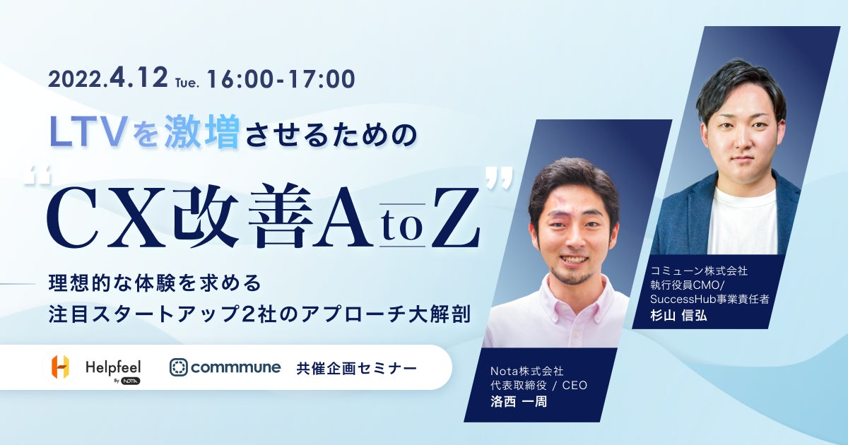 革新的な疑問解決エンジン「Helpfeel(ヘルプフィール)」( https://helpfeel.com/ )を提供しているNota株式会社(以下、Nota)は、企業とユーザーが融け合うカスタマーサクセスプラットフォーム「commmune(コミューン)」(https://commmune.jp)を開発・提供するコミューン株式会社と初となる共催ウェビナーを開催します。