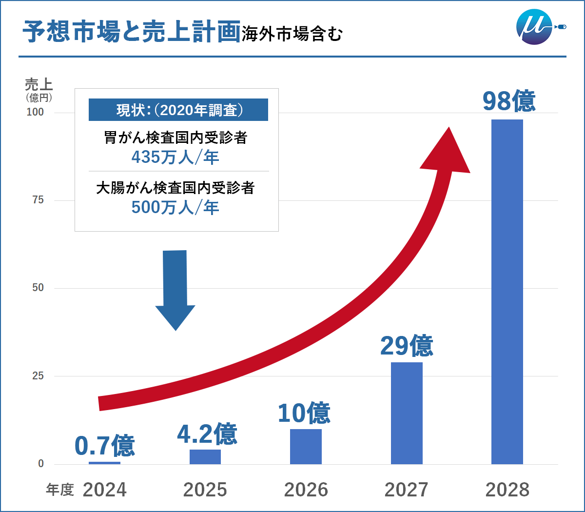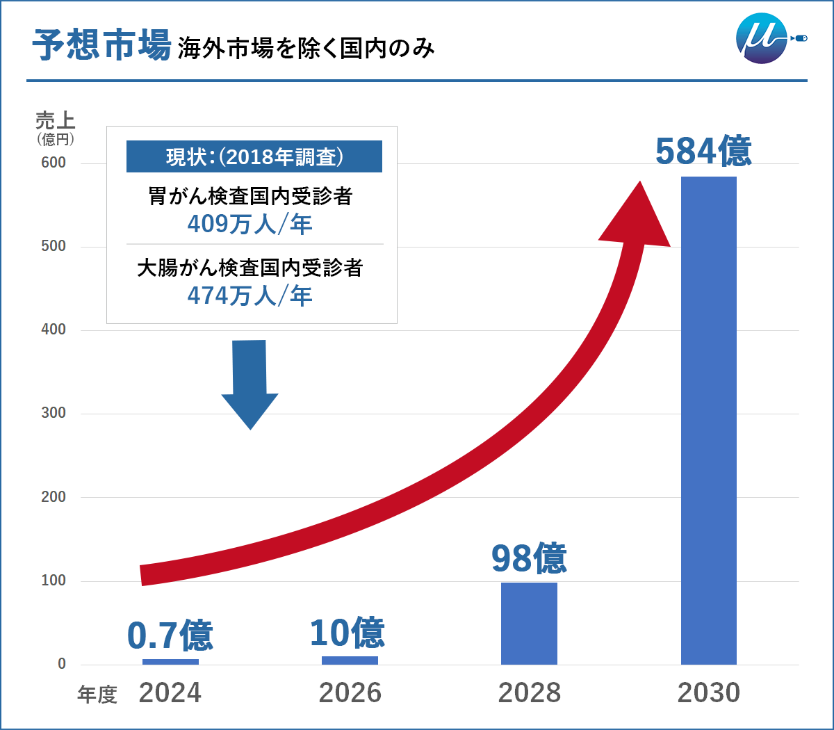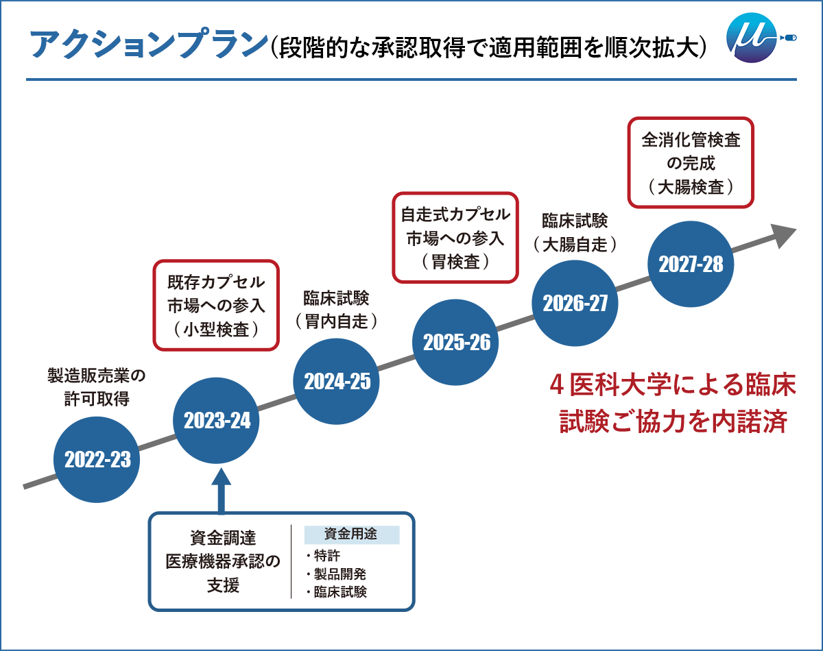 ・まずは2024年を目途に小腸検査用の既存カプセル内視鏡の承認を取得して販売を開始し、2025年~26年には胃検査を対象とした自走式カプセル内視鏡の市場に参入。更に2027年~28年を目標に自走式カプセル内視鏡による大腸検査をスタートさせ全消化管検査を完成させる計画です。