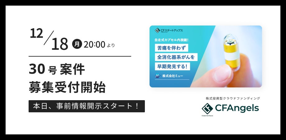 株式投資型クラウドファンディング「CF Angels」、第30号プロジェクトの情報開示スタート、募集開始は12月18日(月) 20:00を予定