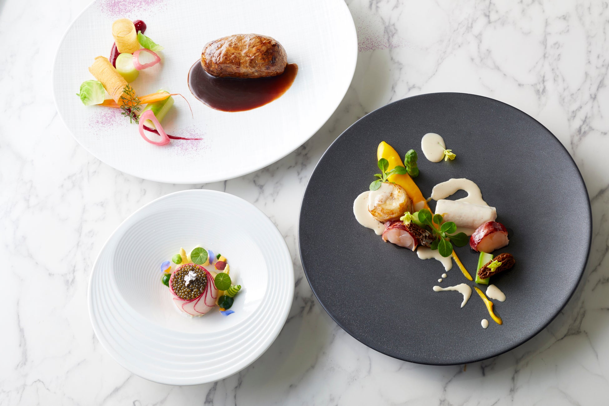 旬の毛蟹を使用した「毛蟹のエッグロワイヤル キャビア飾り」や高級魚ハタやアーティチョークを用いた、南仏地方の伝統料理「ハタのポワレとアーティチョークのバリグール風」。さらに、ナスやズッキーニなどの旬の野菜を添えた「牛フィレ肉のア・ラ・フィセル 初夏野菜とタイム香り華やぐソースと共に」などクラシカルなフレンチを心ゆくまでお楽しみいただけます。千々和ソムリエが選定したワインとのマリアージュもご堪能ください。