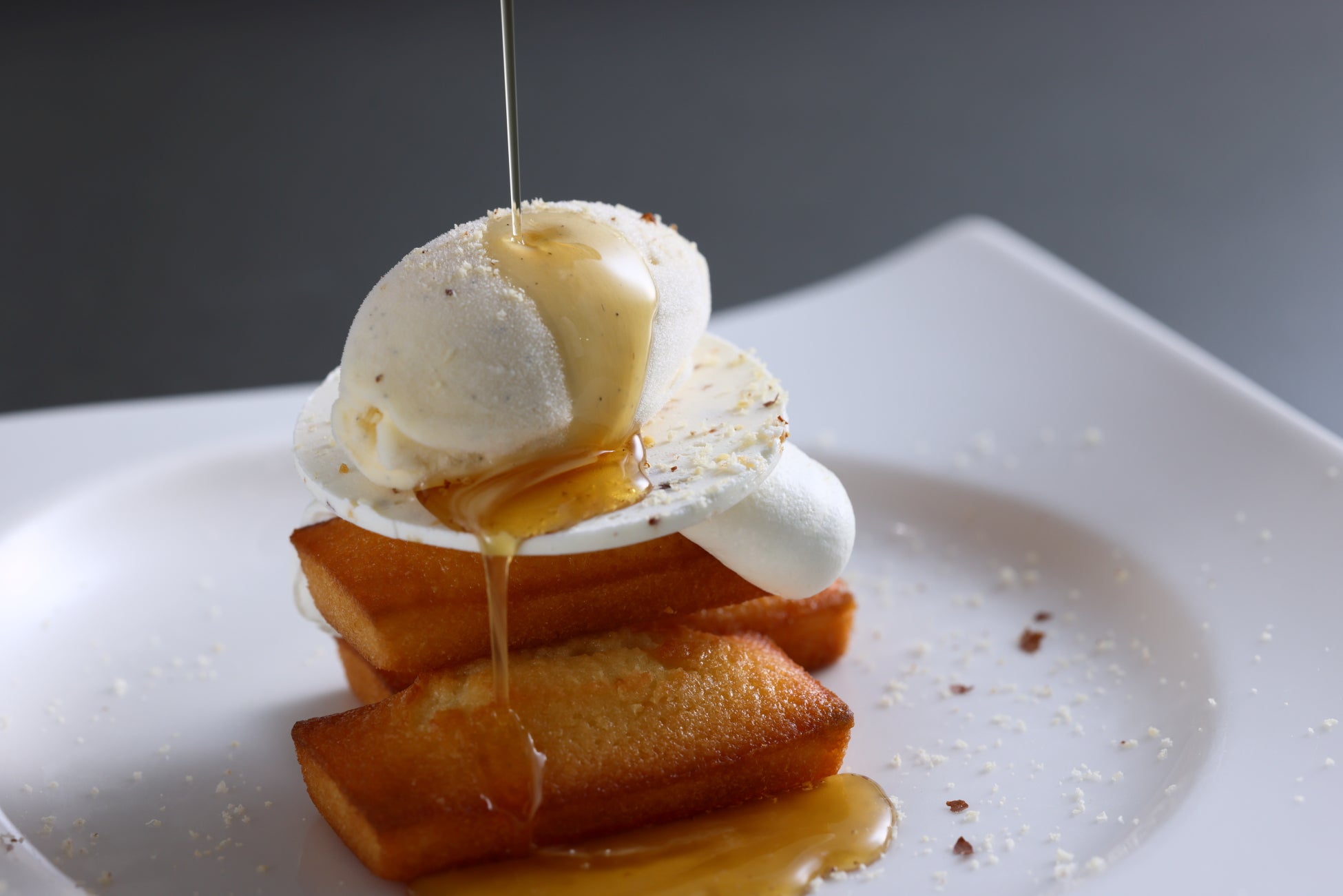 東京と兵庫にカフェを併設する路面店では、自慢のフィナンシェをデセールに仕立てた「デセール・フィナンシェ」を期間限定で提供いたします。シェフがお客様の目の前で、仕上げにアーモンドを削り、お好みで温めたメープルシロップをかけ、香りとライブ感をお楽しみいただける本格的なデザートです。