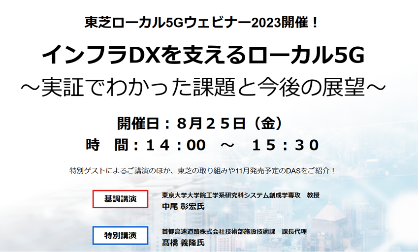 本セミナーでは、当社が発売する予定のローカル5G対応分散型アンテナシステム(DAS※)の製品紹介、ローカル5Gを活用した実証・技術開発の紹介を含めたスペシャルセッションのほか、特別ゲストとして、東京大学大学院工学系研究科教授中尾彰宏氏および首都高速道路株式会社高橋義隆氏にも登壇いただく予定です。