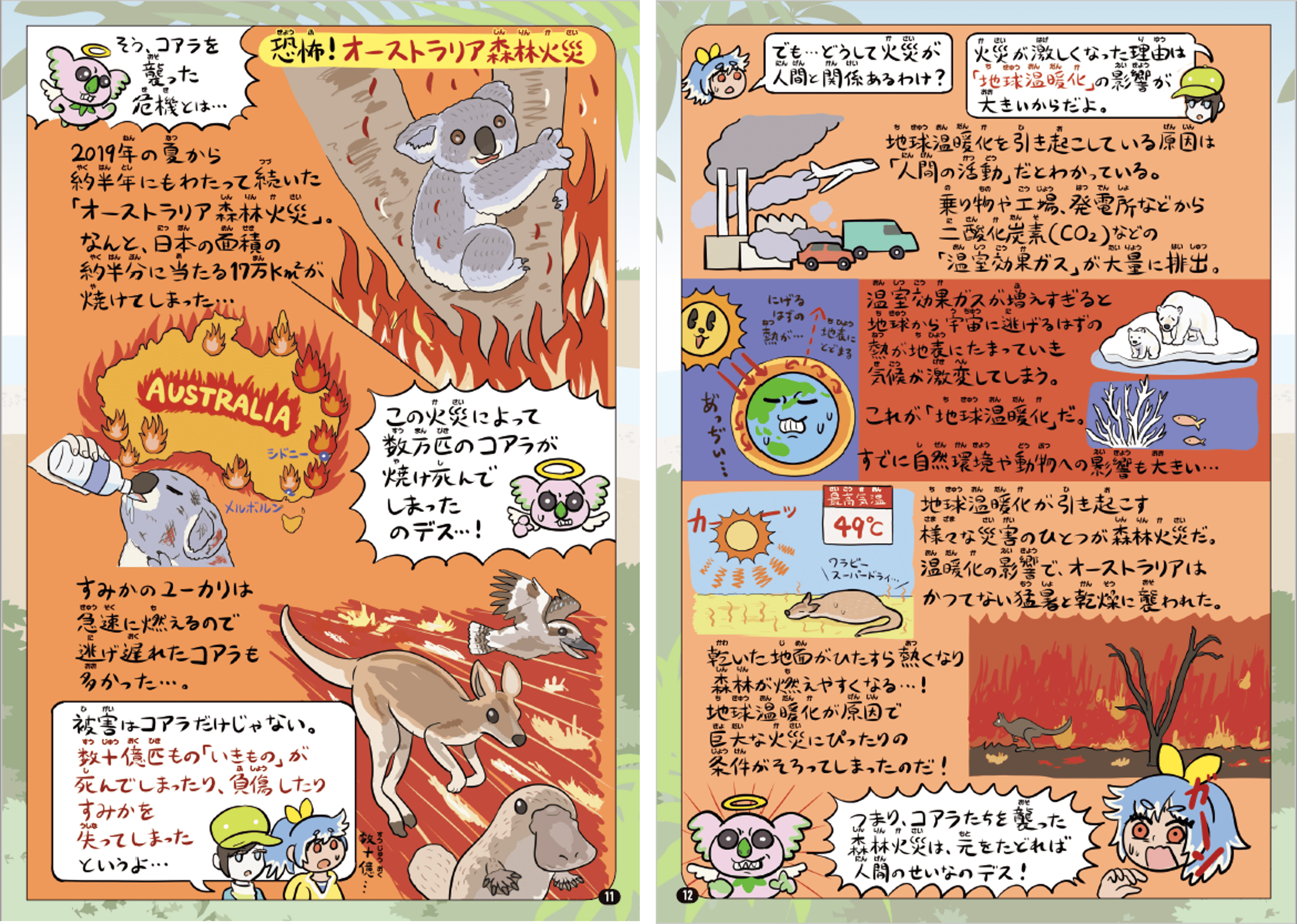 オーストラリア、コアラと聞くと2019年に発生した「オーストラリア森林火災」が思い起こされます。本書でもイラスト図解で解説しています。この火災は半年間にもわたり、なんと日本の面積の約半分に当たる17万㎢が焼かれ、コアラやその他の数十億匹のいきものたちの命が失われてしまいました。人間の活動が引き起こしている「地球温暖化」が火災の激化の一因でした。