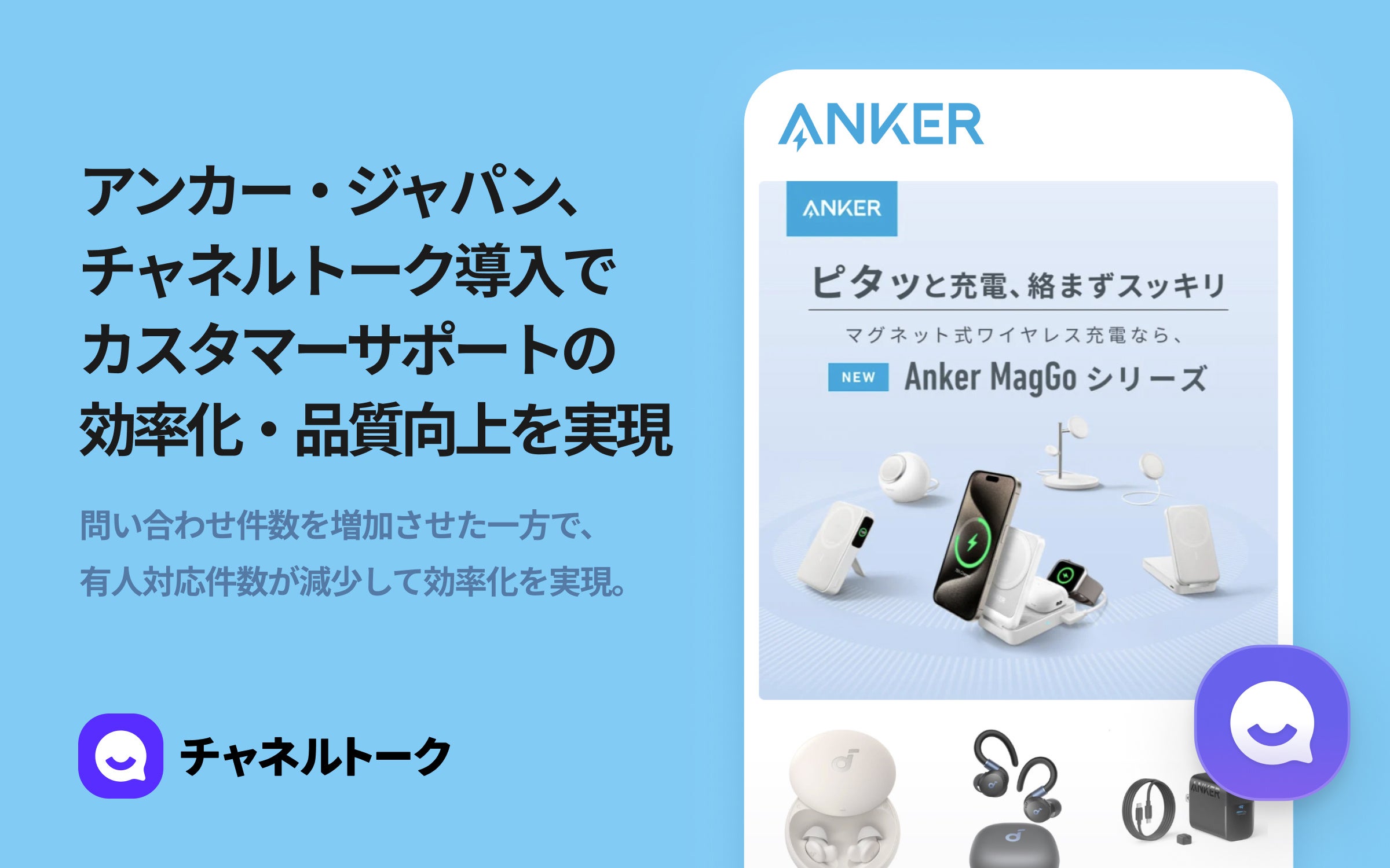 株式会社Channel Corporation(所在地:東京都中央区、CEO:玉川葉)が運営するAll-in-one AIビジネスメッセンジャー「チャネルトーク」は、Ankerグループの日本法人、アンカー・ジャパン株式会社(本社:東京都千代田区、代表取締役CEO:猿渡 歩)が運営する公式オンラインストア(https://www.ankerjapan.com/)にチャネルトークを導入し、カスタマーサポートの業務が効率化され、顧客の有人対応の待ち時間の短縮化を実現。より多くの顧客に問い合わせをいただけるようになりました。