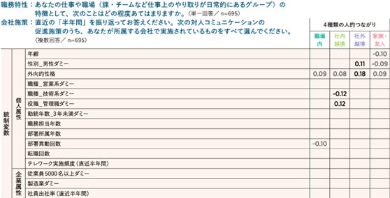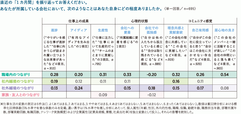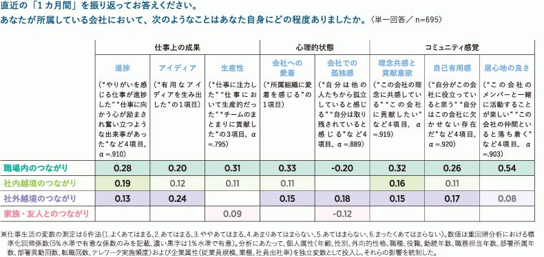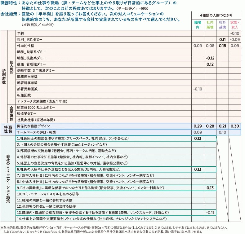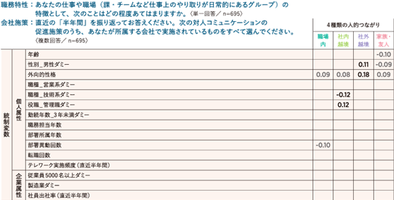 ⇒職務上で、影響を与える相手や協力すべき相手が多くまた明示的であることが、職場内や他部署との相談・協力し合うつながりを活性化する。のみならず、社外越境のつながりに学びアイディアを得ることや、家族・知人との親しいつながりを豊かにすることをも動機付けるようである。