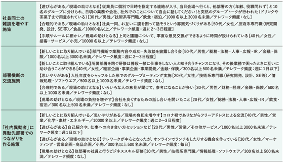 ⇒コミュニケーションの活性化は現場社員の一定の労力や時間を伴うことが避けられず、効果を見据えて取捨選択しつつも信念をもって大胆に行う必要がありそうだ。