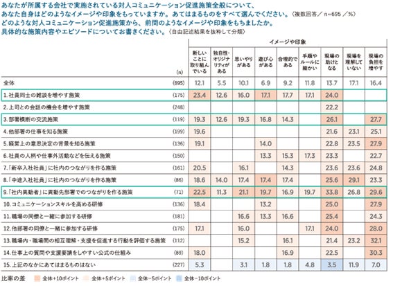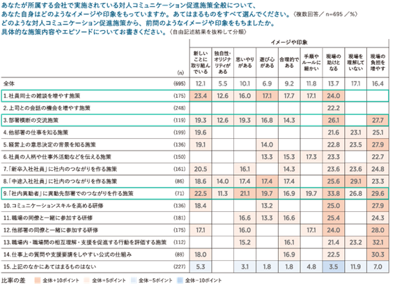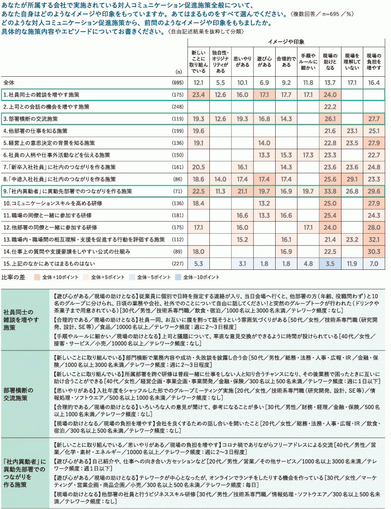 ・“新しいことに取り組んでいる”“思いやりがある”“遊び心がある”など、受け手の感情を動かすイメージや印象については、“1.社員同士の雑談を増やす施策”“3.部署横断の交流施 策”“9.「社内異動者」に異動先部署でのつながりを作る施策”に着目し、そのようなイメージや印象をもった理由や具体的なエピソードについての記述を抜粋した。