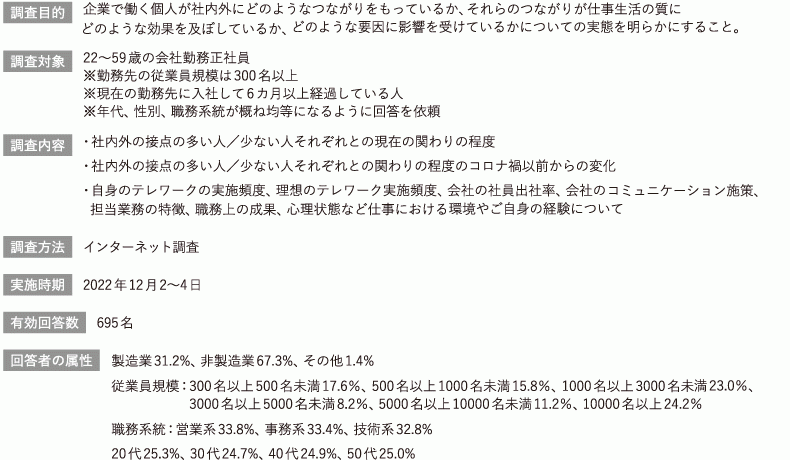 そこで、仕事生活に関する人のつながりの現状を捉え、より良いつながりのために組織ができることを検討するための調査を行った。