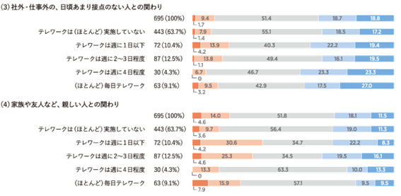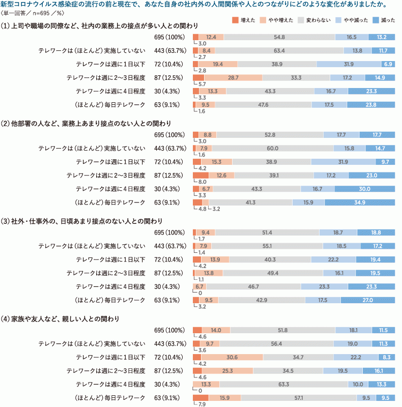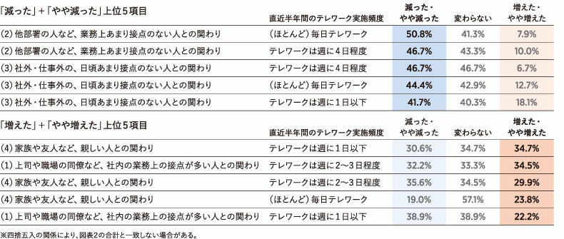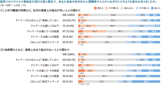 図表1 コロナ禍以前と比較した人との関わりの変化(テレワーク実施頻度別)