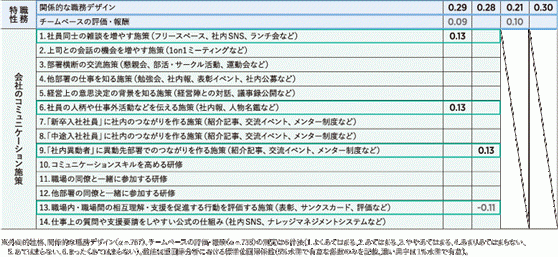 ⇒職場内のつながりに限っても、評価や報酬などの制度で「つながらせる」ことの効果は限定的であり、日々の業務上で互いに関わる機会を作る効果の方が大きいといえる。