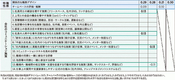 ⇒職場内で相互に相談や協力ができ、 仕事外の話も可能なつながりが、仕事を「進捗」させ「生産性」を高める、「会社への愛着」を高め「会社での孤独感」 を低下させる、「理念共感と貢献意欲」を高め「自己有用感」や「居心地の良さ」を感じさせるといった効果をもち、仕事生活の質的向上の要であることが分かる。