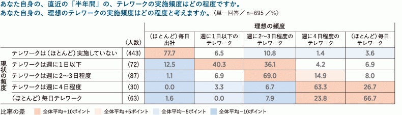 ・テレワーク実施頻度の現状と理想についての解答は、それらが一致する対角線上に最も多く分布している。