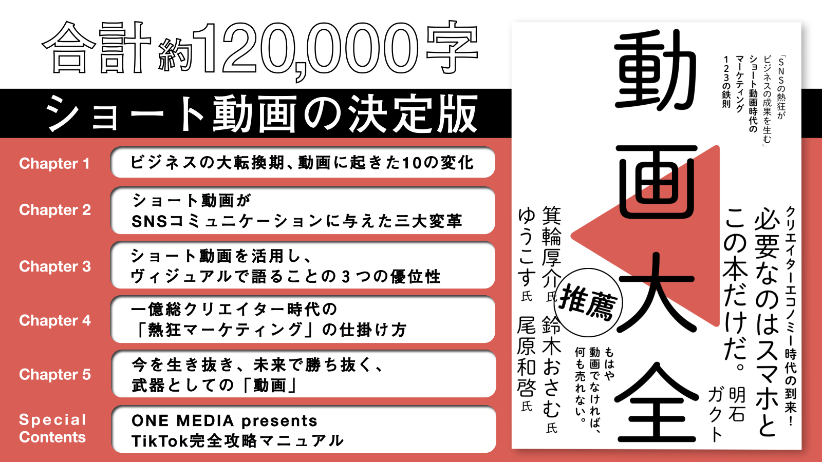 ワンメディア株式会社(以下、ワンメディア)代表取締役CEO 明石ガクトの著書『動画大全』が、2023年3月下旬より全国書店にて販売されます。本書籍の予約開始後、2月5日(日)時点でAmazon「本 総合/最新リリース部門」ランキングにおいて1位を獲得したことをお知らせいたします。