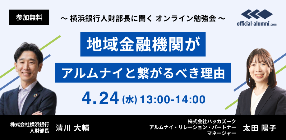 本記事の掲載を記念し、ハッカズーク主催にて「地域金融機関がアルムナイと繋がるべき理由」と題し、オンラインセミナーを開催いたします。本セミナーでは、地域銀行で初めて「アルムナイネットワーク」を構築した横浜銀行 人財部長の清川大輔様をお迎えし、「地域金融機関がアルムナイと繋がるべき理由」というテーマで横浜銀行がアルムナイに取り組む目的や、具体的な運用方法、生まれている成果などをお話しいただきます。