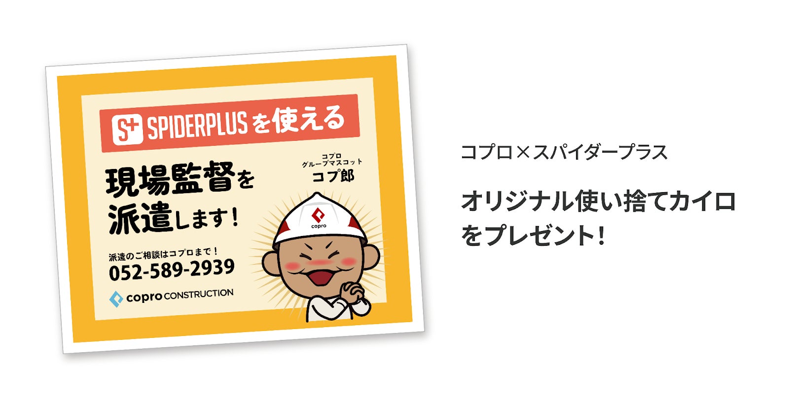 ブースにお越しいただいた先着1,200名様に、コプロ×スパイダープラスオリジナル使い捨てカイロをプレゼントいたします。今回の共同ブース限定のグッズをご来場の記念に、ぜひお受け取りください。