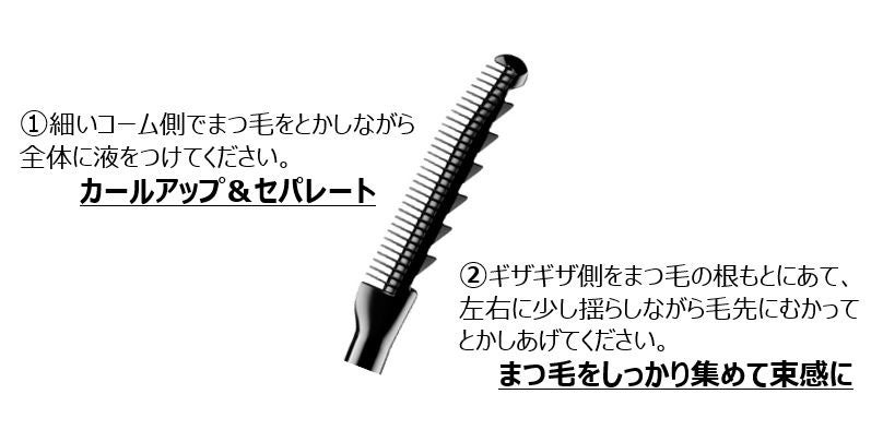 その秘密は、新開発した 美束&セパレートコーム。細いコームと、ギザギザコームの両側ダブルコームで、まつ毛をセパレートしながらも、しっかり液を塗布。とかしあげるだけで、ダマのない美しい束感まつ毛の仕上がりに。